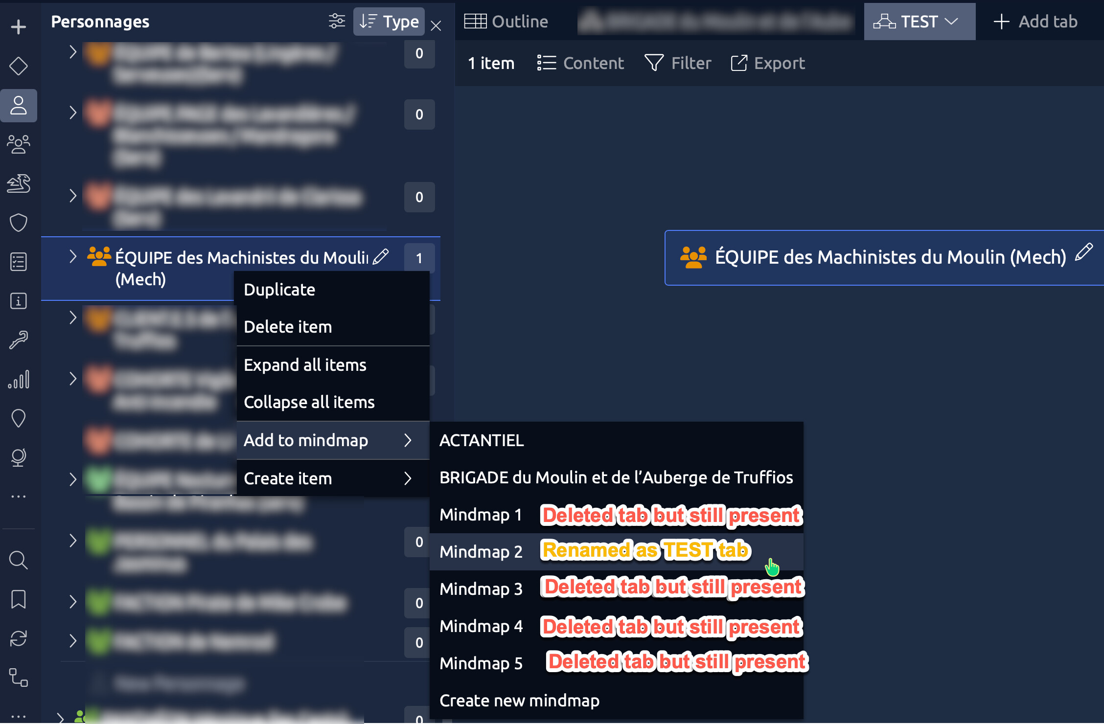 After renaming a Mindmap tab (e.g., from “Mindmap 2” to “TEST”), the context menu (accessed via right-click on an item → “Add to Mindmap”) continues to display the original tab name (“Mindmap 2”), rather than the updated name (“TEST”) => (Screenshot in attachment)