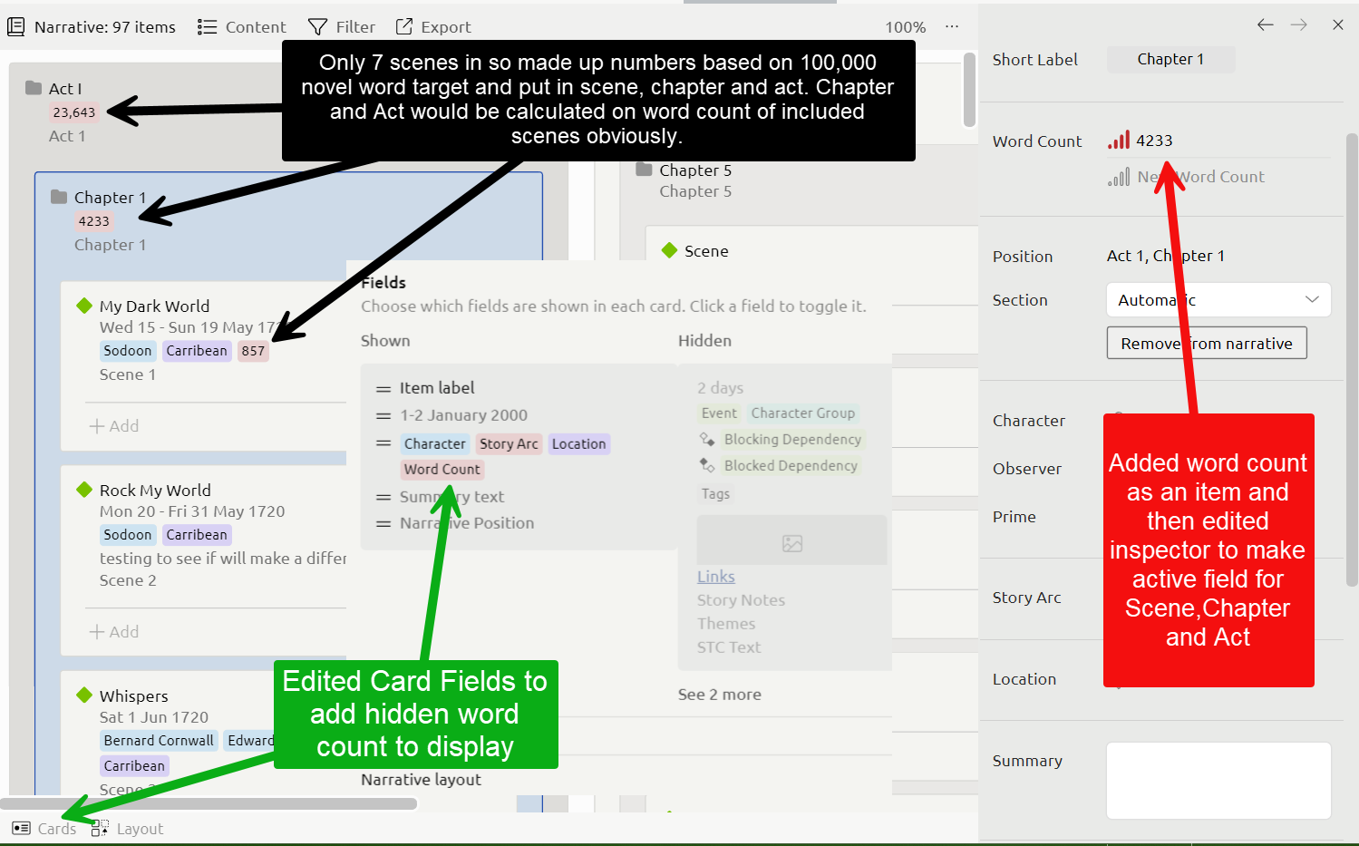 For example: I have a set of scenes I place within a folder and each scene has an estimated word count property. If I check off the proposed option, the folder should have a calculated estimated word count based on the scene items within.