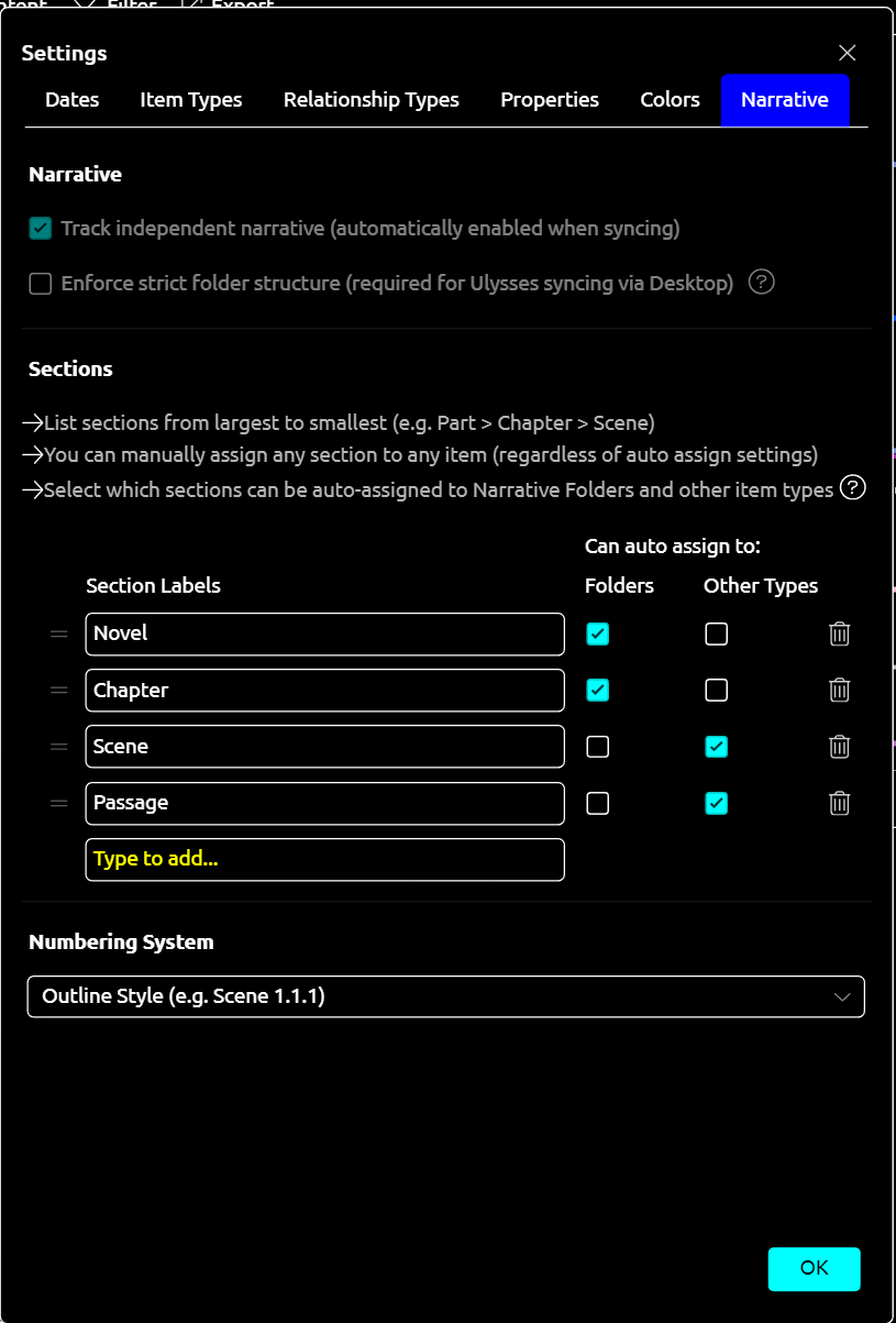 This could also be solved by having an option to tell the program to automatically create/update the parent/child nesting when altering the narrative order. Then the current calculation option would work seamlessly. I can see some people not liking that automation though, so it’d probably need to be optional.