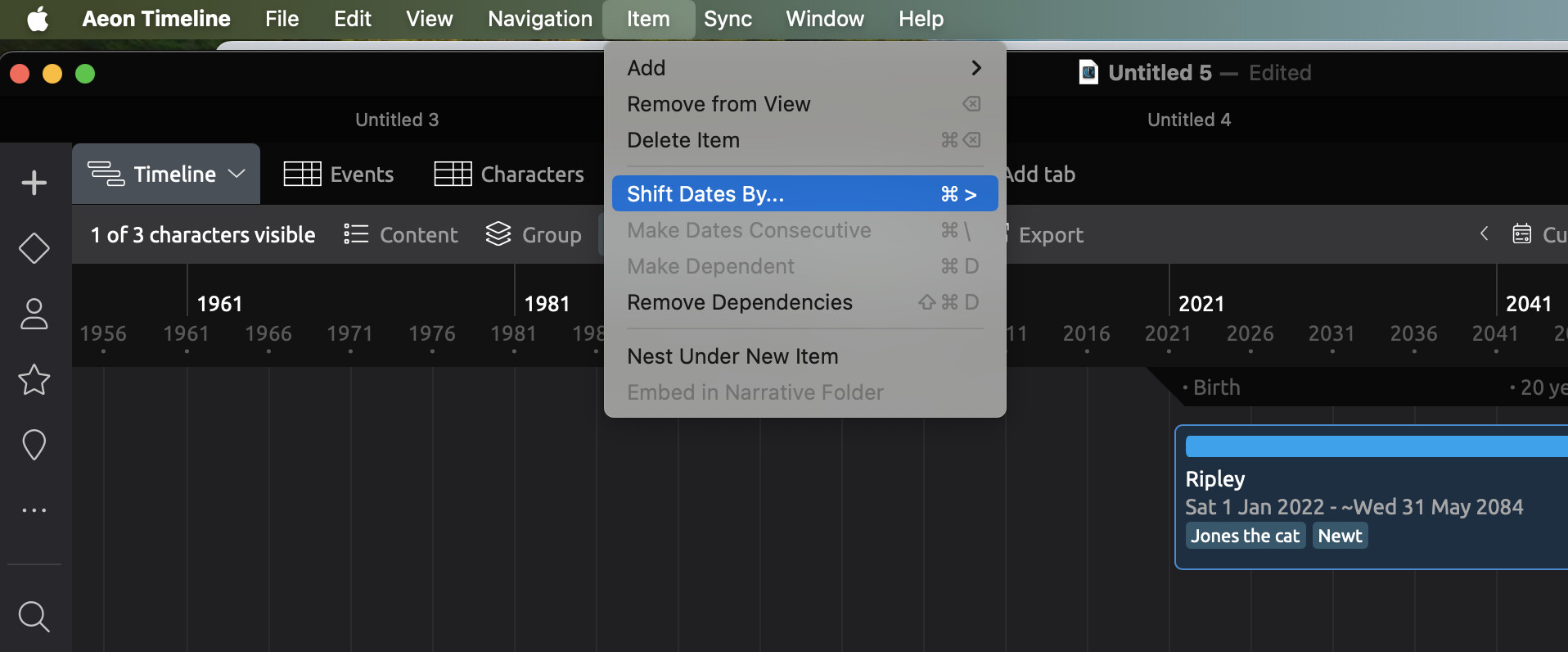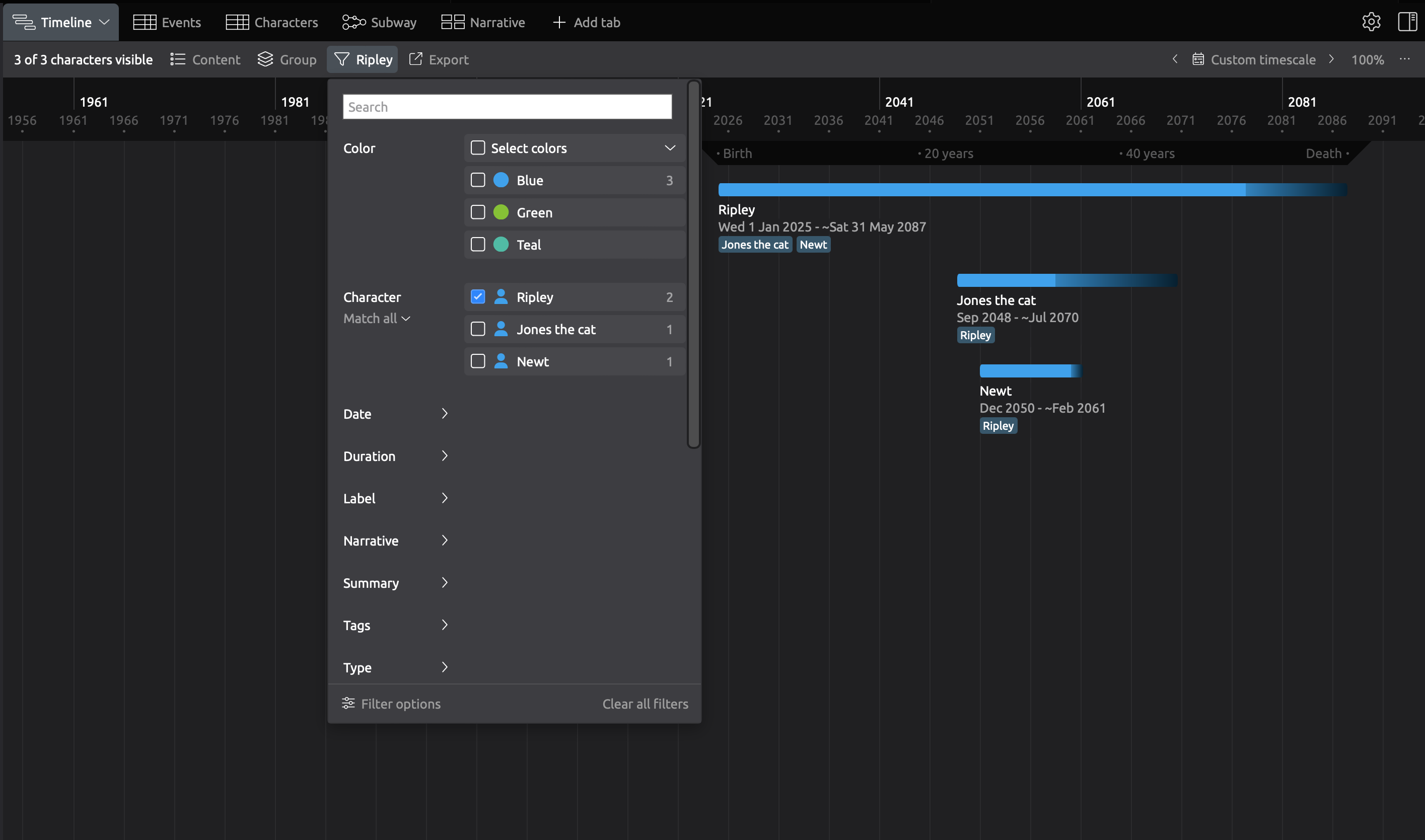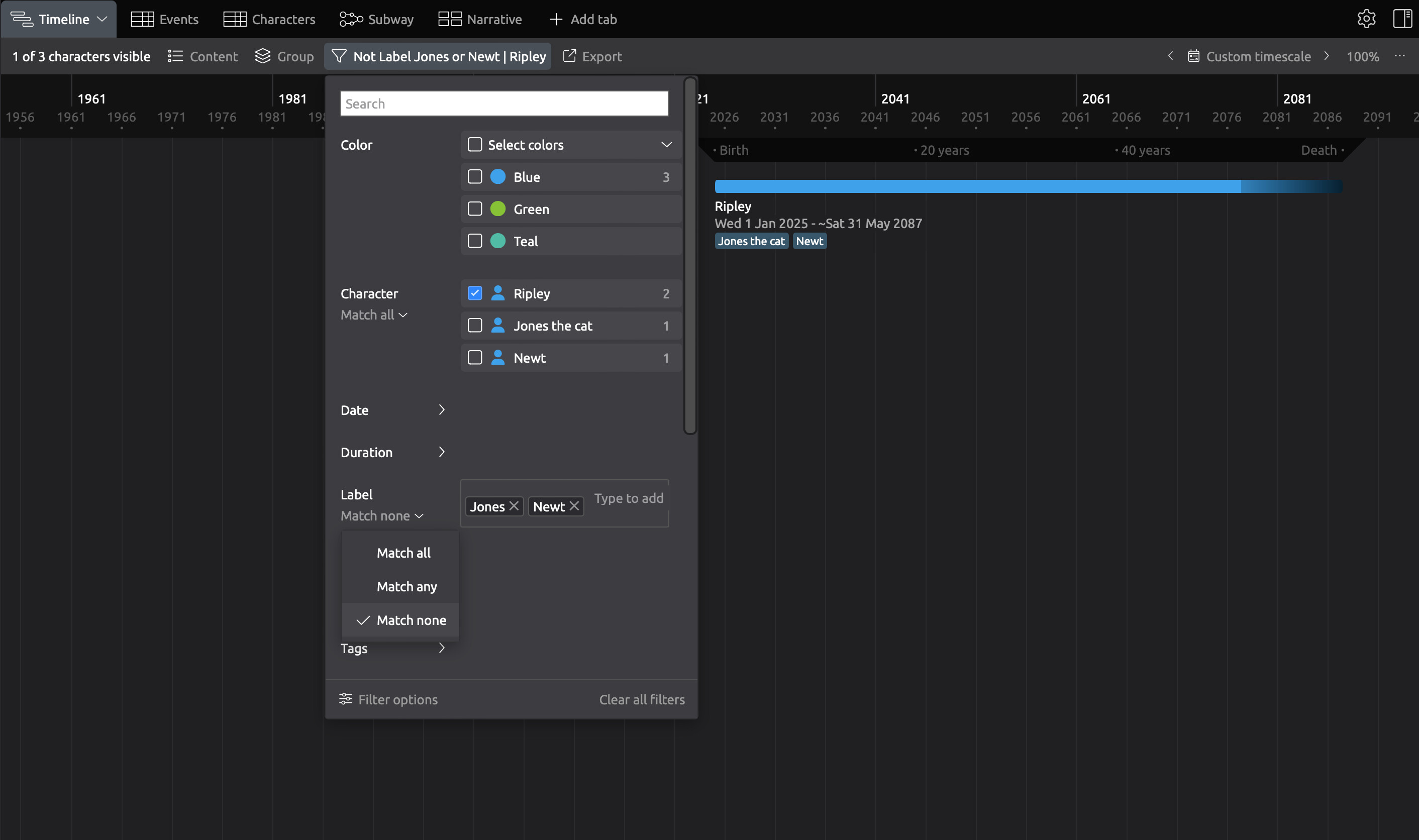 Next, I’ve got a filtering problem that I have somehow created. I’ve got a filtered view that just shows my character Nyx. This makes her age show up in the top ruler, which is what I want. But within this view, I created two more characters: Juniper and Aurelian. I put in their birth/death dates and got to the point where I wanted to filter them back out. Only I realized… the view already was set to Nyx only! So these new characters now seem to be permanently filtered along with Nyx as if they were one person. See screenshot below.