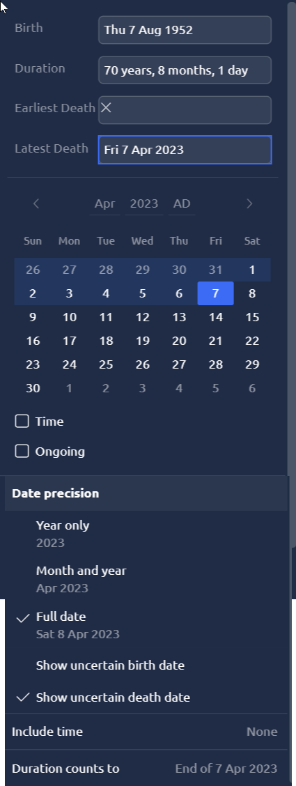 It lets me put the year in without the month, but entering a month makes it invalid. Other times it lets me put in things like “Apr 2888” but “May 2888” it says is invalid. Very weird. I ended up having to use the mouse to slide the character’s end point to the correct spot.