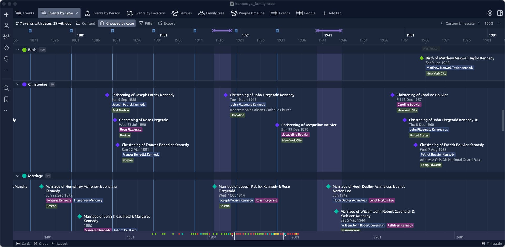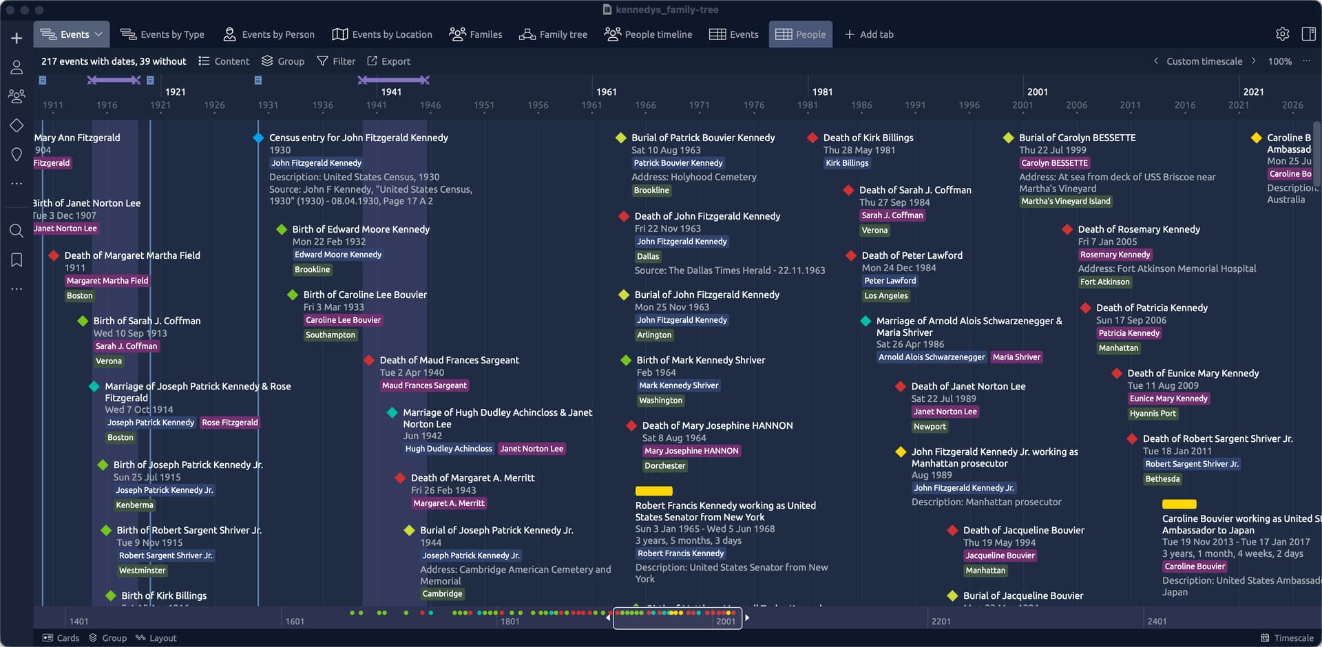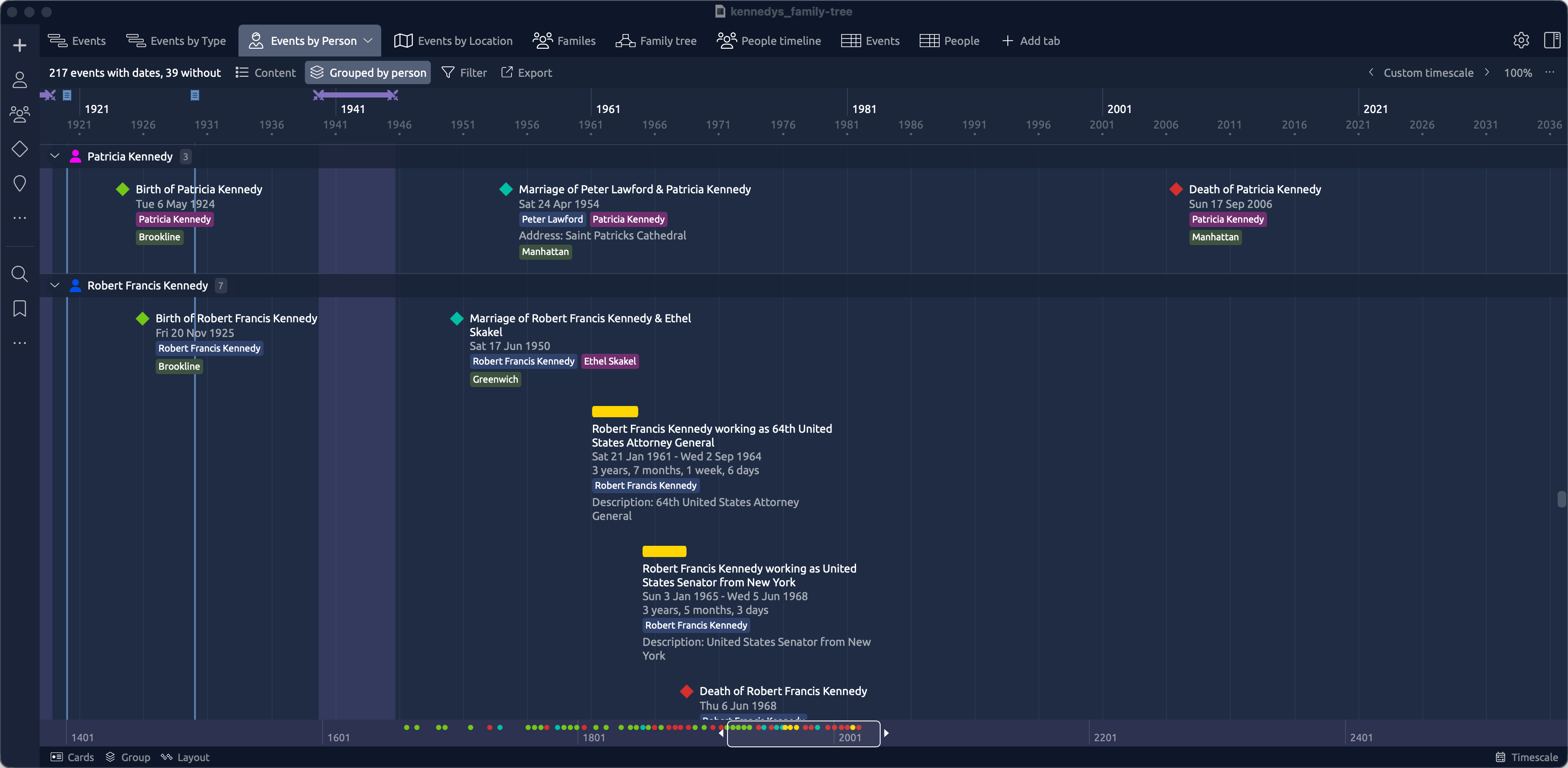 These exported files can then be used in the likes of Excel or Numbers (or a database etc) to conduct some additional research. They can also be used to import your information into Aeon Timeline (using the Import CSV option). See below for some screenshots. This demo uses a publicly available gedcom file for the Kennedy family. All of these views (with the exception of the Family tree view) required zero intervention after importing the csv data to the template file.