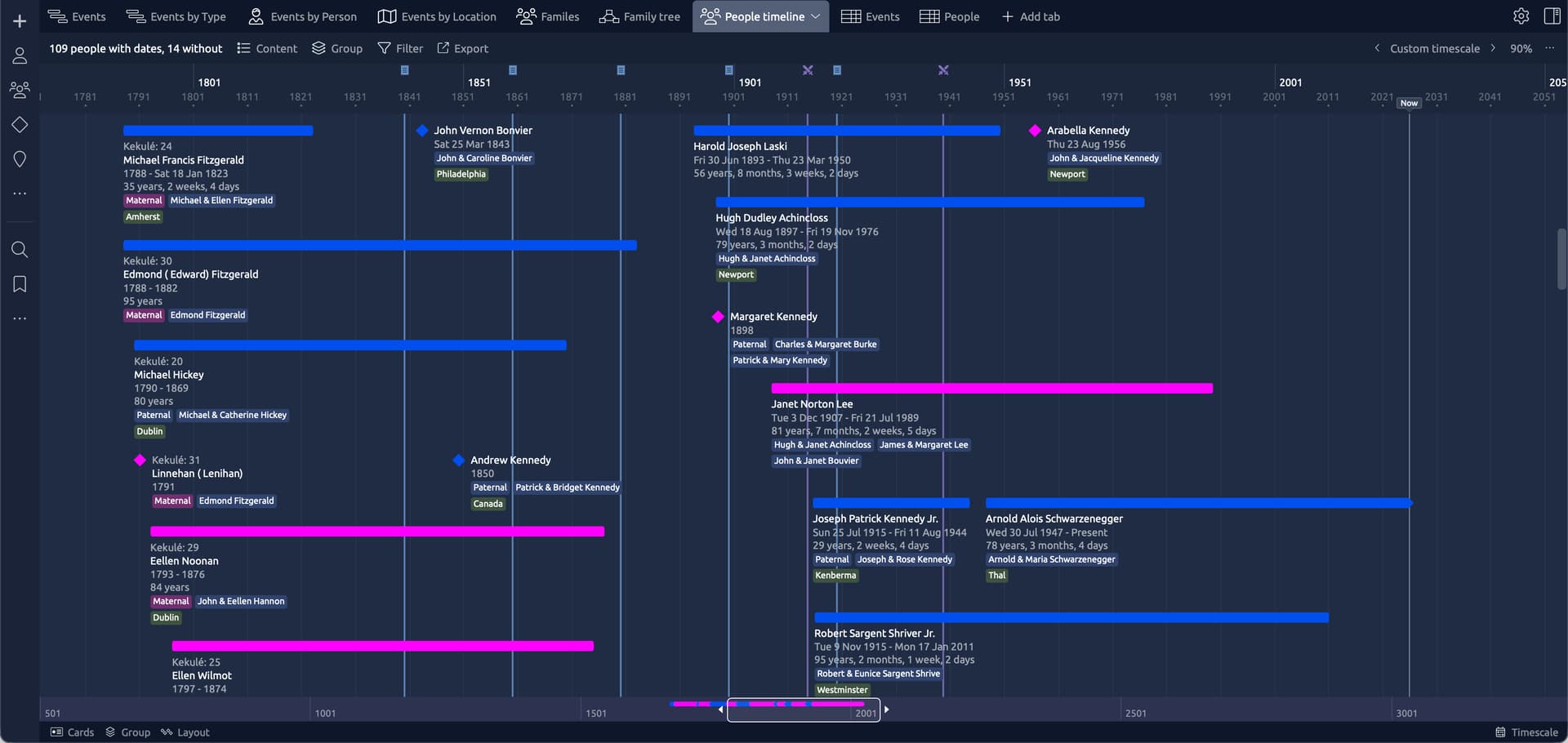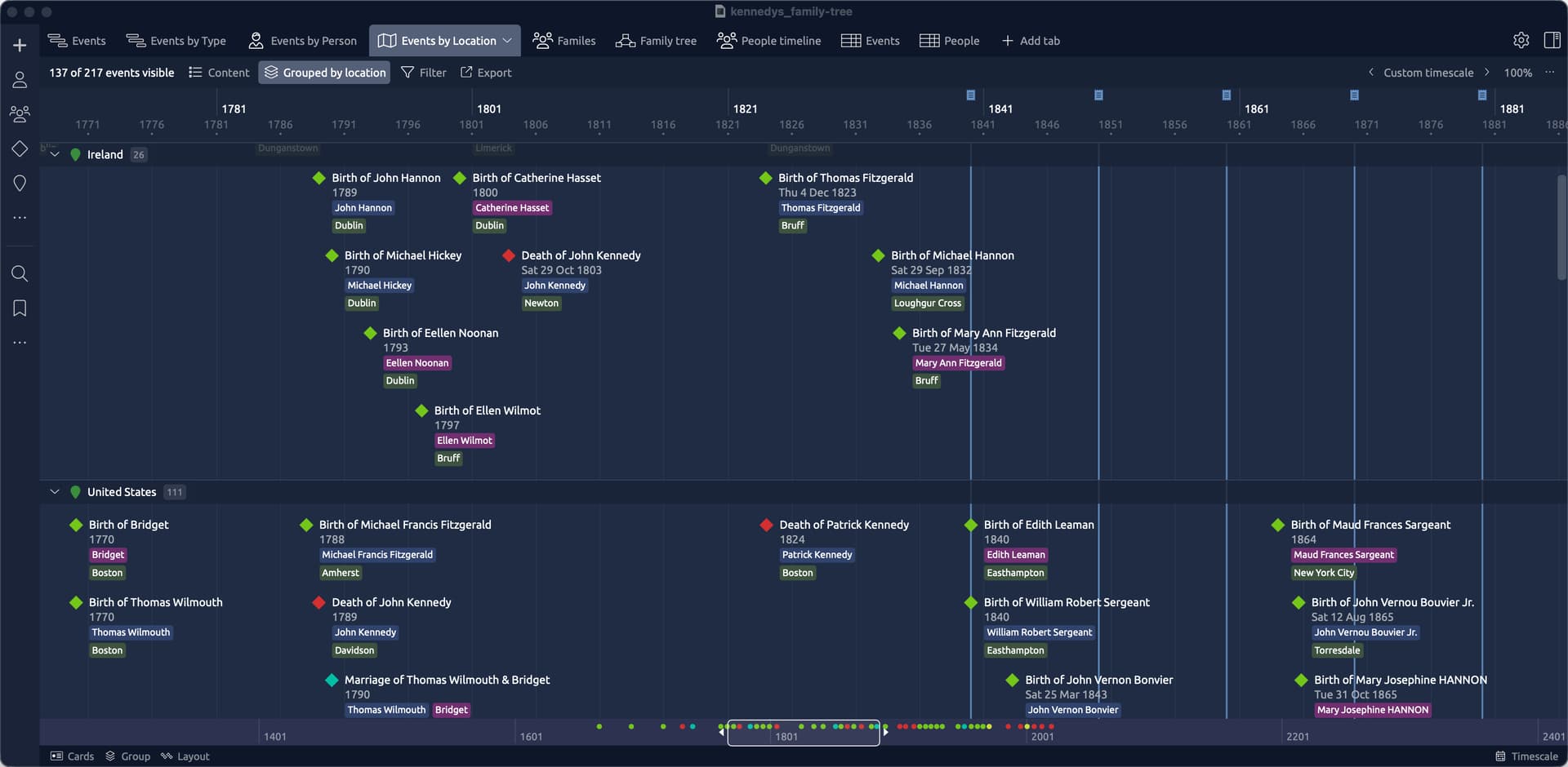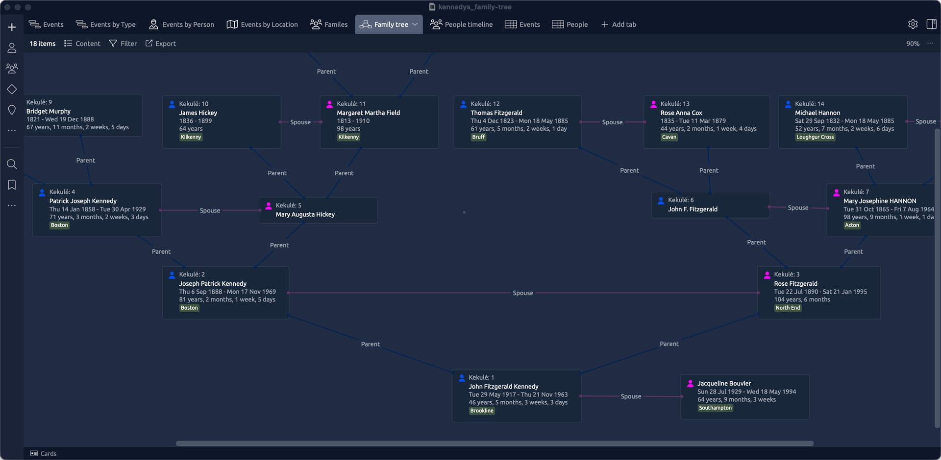 These exported files can then be used in the likes of Excel or Numbers (or a database etc) to conduct some additional research. They can also be used to import your information into Aeon Timeline (using the Import CSV option). See below for some screenshots. This demo uses a publicly available gedcom file for the Kennedy family. All of these views (with the exception of the Family tree view) required zero intervention after importing the csv data to the template file.