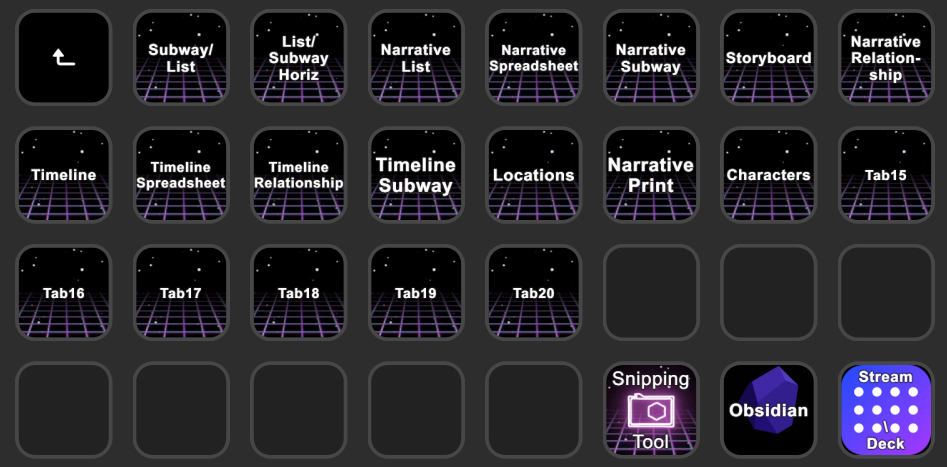 I assigned custom tabs 1 through 9 to Aeon Timeline’s keyboard shortcuts using Hotkey buttons, i.e., Ctrl+1, Ctrl+2, etc. For custom tabs 10 through 14, which fall outside Aeon Timeline’s assignable keyboard shortcuts, I used Stream Deck’s Open buttons to trigger each AutoHotkey script. Because I might want to add additional custom tabs, I wrote the scripts for the unused placeholder tabs 15 to 20 and assigned them buttons.