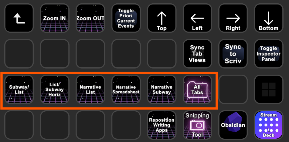 This is my default Aeon Timeline view, which automatically displays when Aeon Timeline is the active app. The highlighted buttons represent the custom tabs I most commonly view, plus an “All Tabs” option to show all available custom tabs.