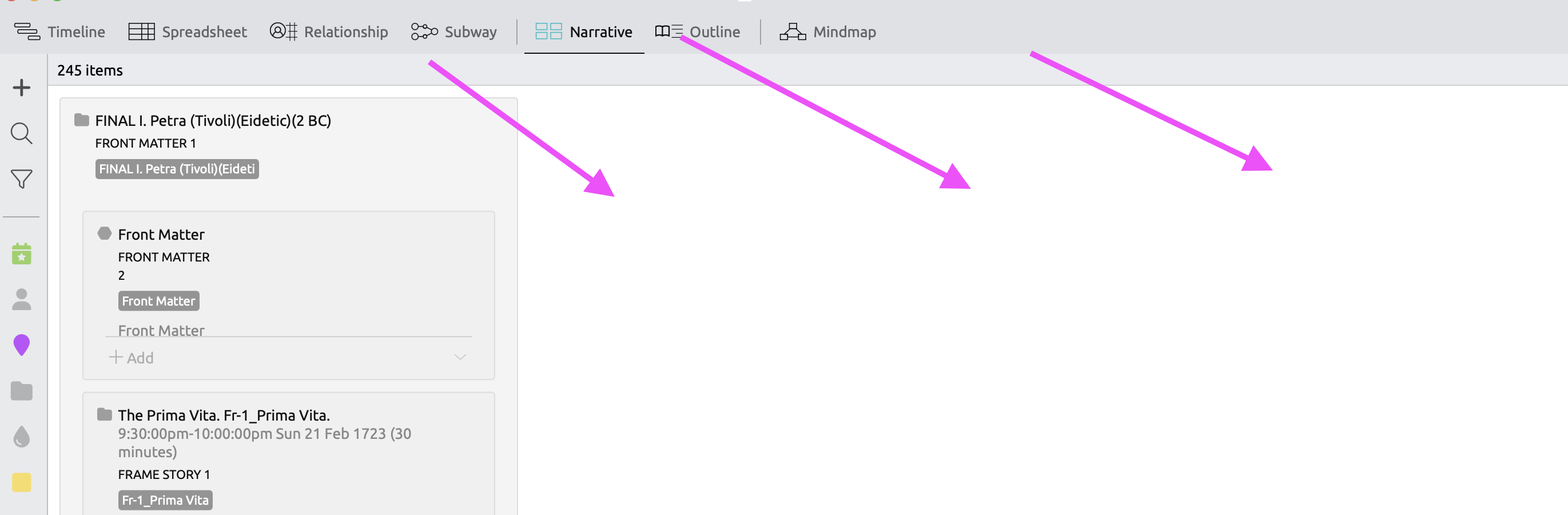 At one point I changed some setting in Aeon and now only one of my synced folders shows up in Narrative View. See screenshot. I can’t recall what I did and I also can’t find any setting that would bring them back. They are still there and still getting synced. They just don’t show in Narrative tab.