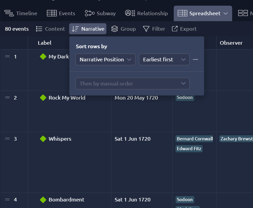 It makes no sense, if I’m syncing with Scrivener, to have the spreadsheet contain elements that no longer exist in the manuscript. Maybe have a Settings toggle “use narrative position” or, even better, a criteria in the code: “if Scrivener sync, toggle use narrative position”.