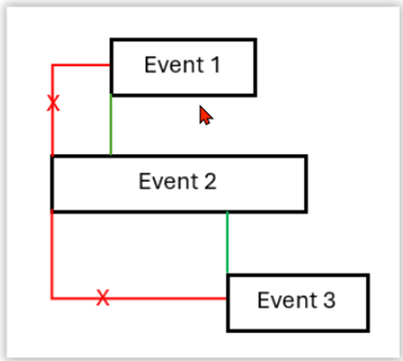 In the attached image, the red lines show the current behavior: dependency lines start from fixed positions on the events. The green lines illustrate the proposed improvement, where each line starts at the actual start point of the related event. The constraints are defined from Event 2.