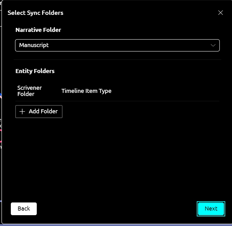 Personally, I’m happy having my various items, such as Character, in Aeon Timeline and not Scrivener. But if I wanted them also in Scrivener, I would add the appropriate Scrivener folder(s) under the Entity Folders selection. At some point, I might do that to have redundant data in both apps. So far, though, I haven’t felt the need to.
