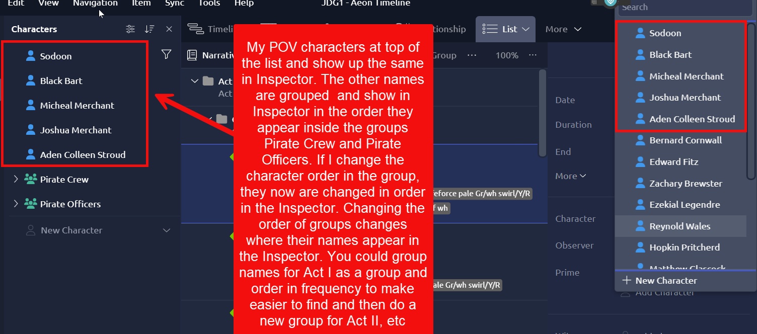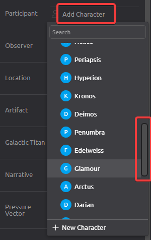 Ideally, I’d like to be able to designate “main characters” who show up at the top of these lists every time. I have a pretty huge number of characters, as you can see from the size of the scroll bar. And they aren’t even all entered, by a long shot. Every time I want to filter or assign participants I get this list where it takes extra steps to locate the character.