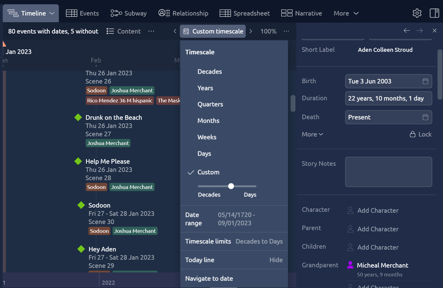 I am setting up character ‘start’ dates based on the first event of my novel, using relative dating. So the main character has a constraint with an offset of 10 years. (She is 10 years old at the start of the novel.) But in the sidebar, her age is listed as 3631 days. I want to have days on the timeline, but it doesn’t make any sense to have days as the age. I can’t find a way to fix this. Any advice?