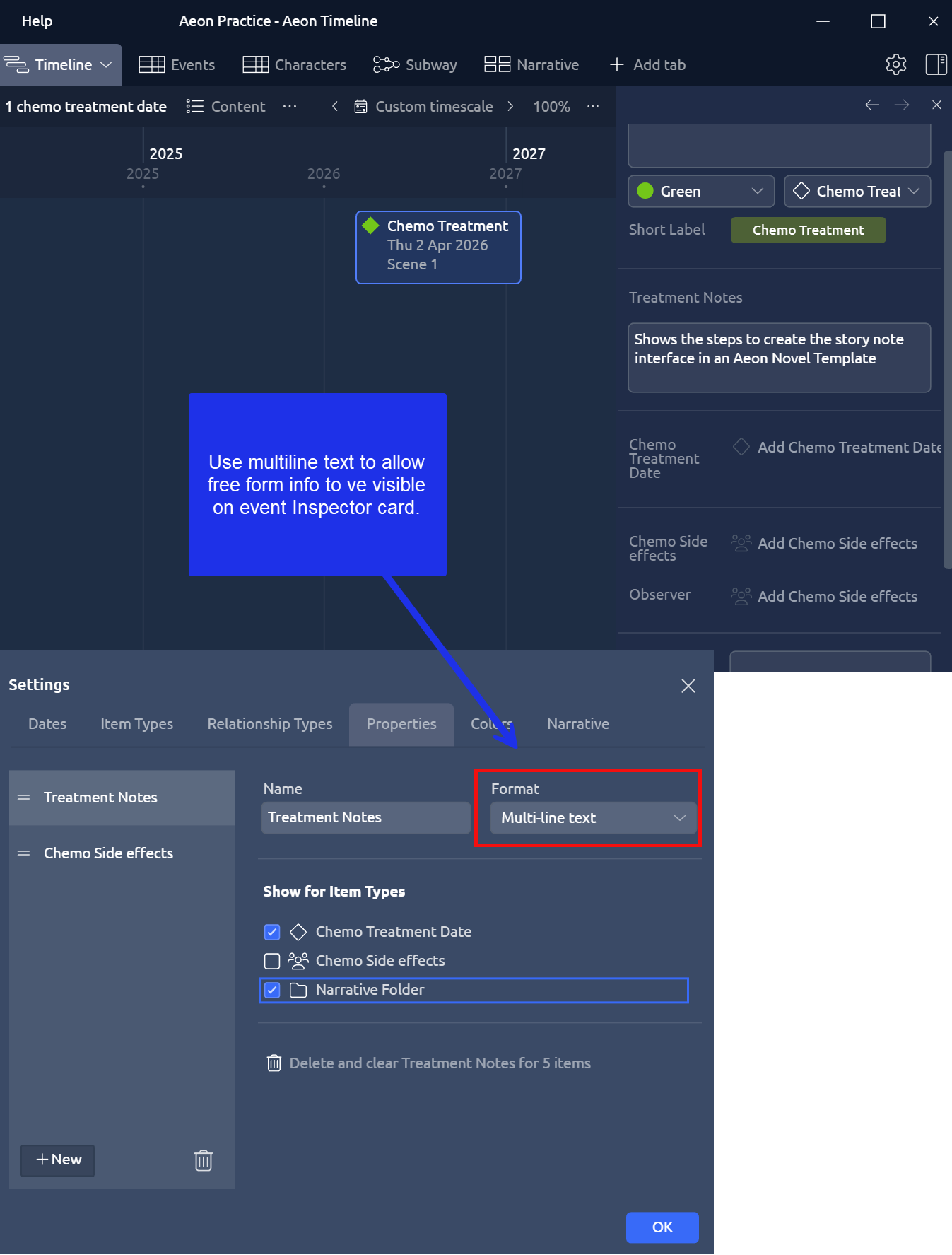 For novels under properties (See when click the cogwheel in the upper right (settings) I add a new entry which is a text field called Story Notes which appears on the Inspector for each event. This could be created with a title of side effects in the properties area allowing you to specify in detail what occurred on a particular day to track. This can or cannot be displayed on the timeline. You can use the filter to even track specific chemo agents or side effects.
