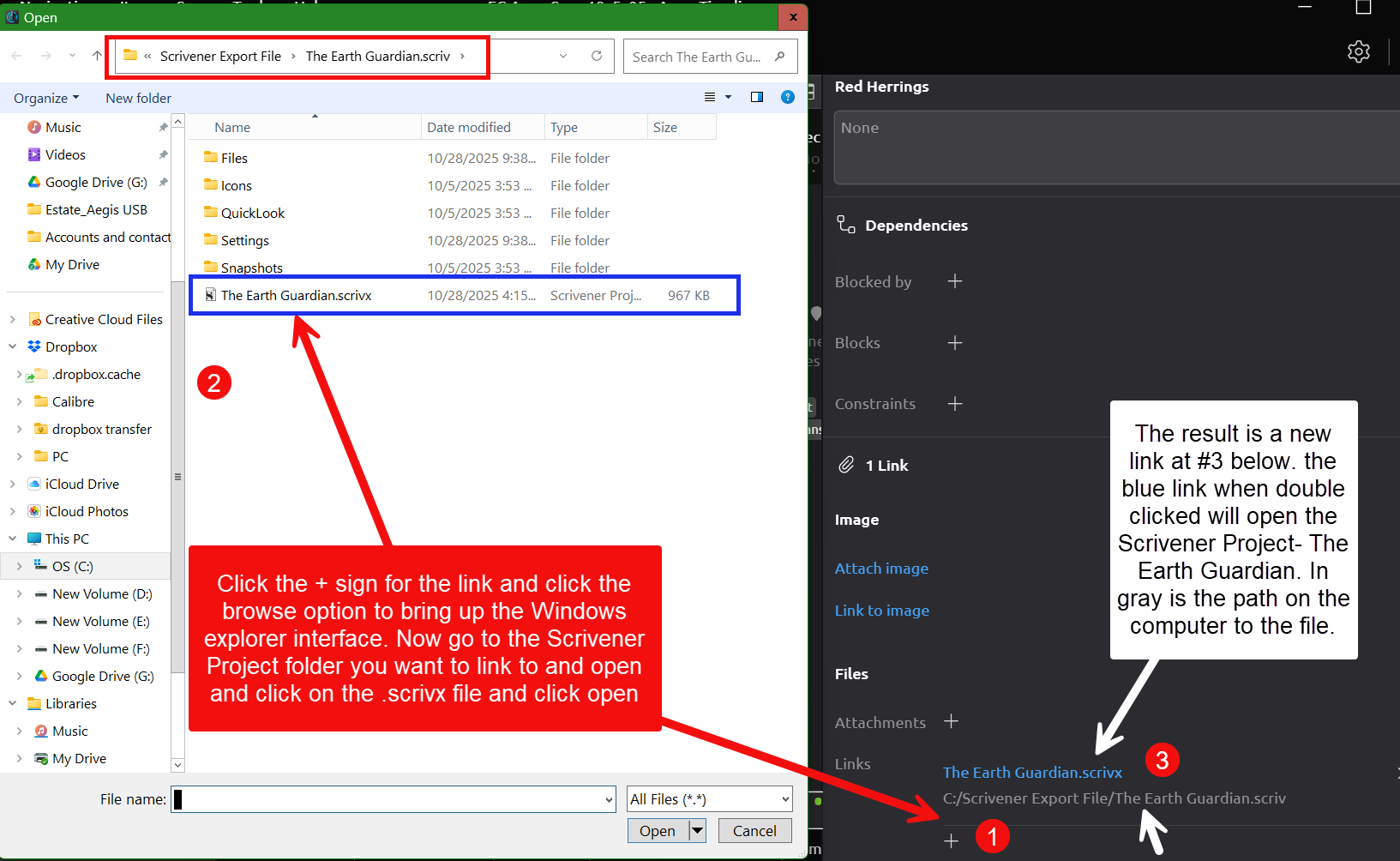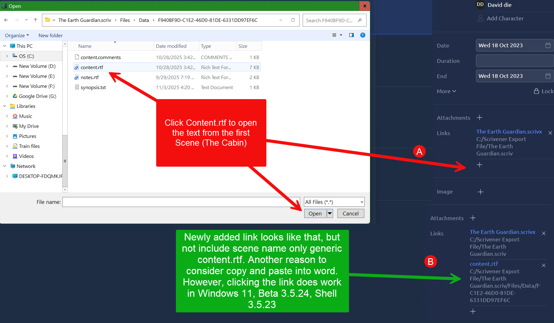 I’ve tried both with the x-scrivener-item://C:/Users and just the plain C:/Users/ links, neither works, Aeontimeline just says ‘There is no file at the path specified’. I tried moving the scrivener file to different areas as well, to no success, does anyone know if I’m missing something?