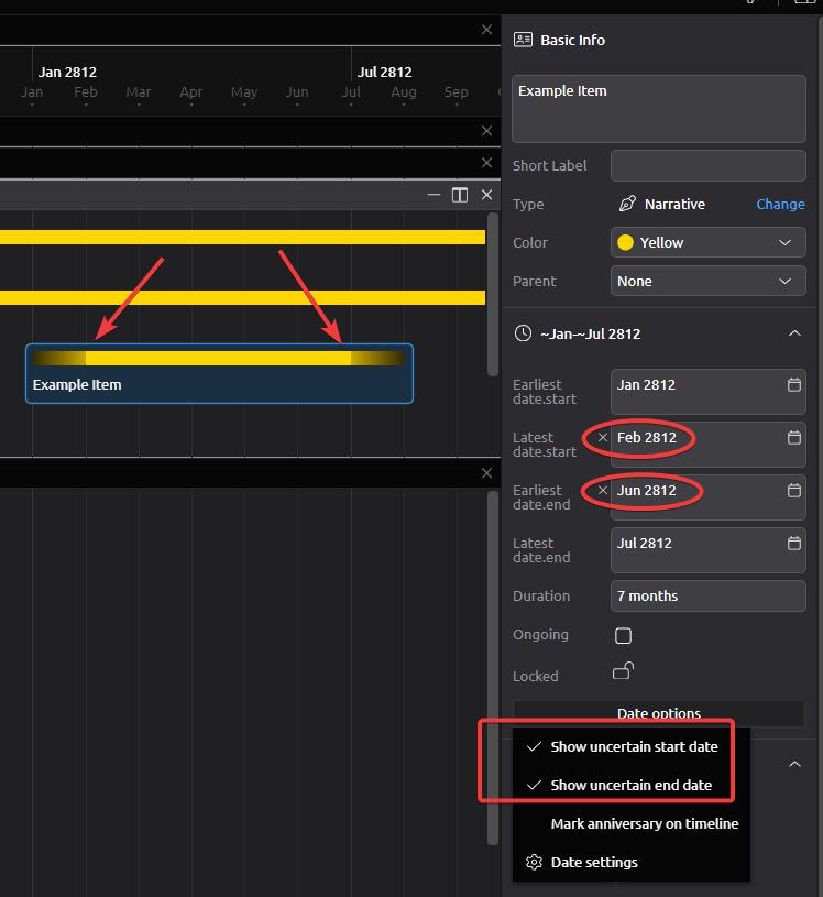 In this screenshot, I’ve set up an example item with “uncertain” start and end dates. I really like how this is displayed visually, but I’ve noticed that if you drag the boundaries visually, the “latest start” and “earliest end” dates do not move along with it. Ideally, the “uncertainty” offset would maintain its size when you move the outer boundaries rather than staying fixed.