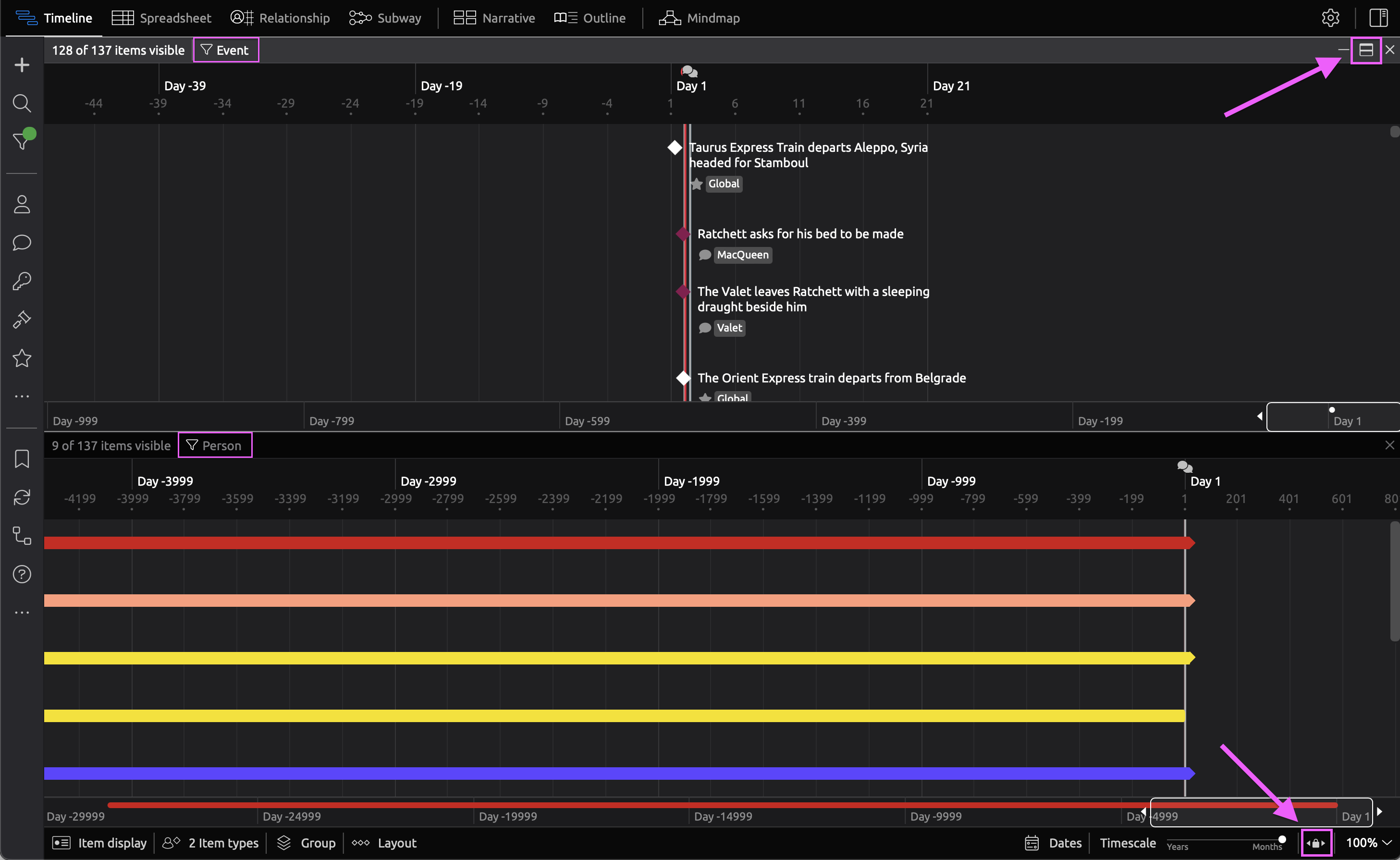 In my personal case, I’ve got several immortal characters who were born many thousands of years before the story begins and they are still alive but not relevant to the early saga. They become relevant later. So what ends up happening is I get tons of blue bars that go across the screen for characters who are still living, somewhere out in the universe, but they are irrelevant to the part I’m filtering for. And there are some immortal characters who actually are relevant, so I want their bars to appear. But then I might want to see events relevant to one story while other events that are still in the timeline but meant for a different story can be hidden.